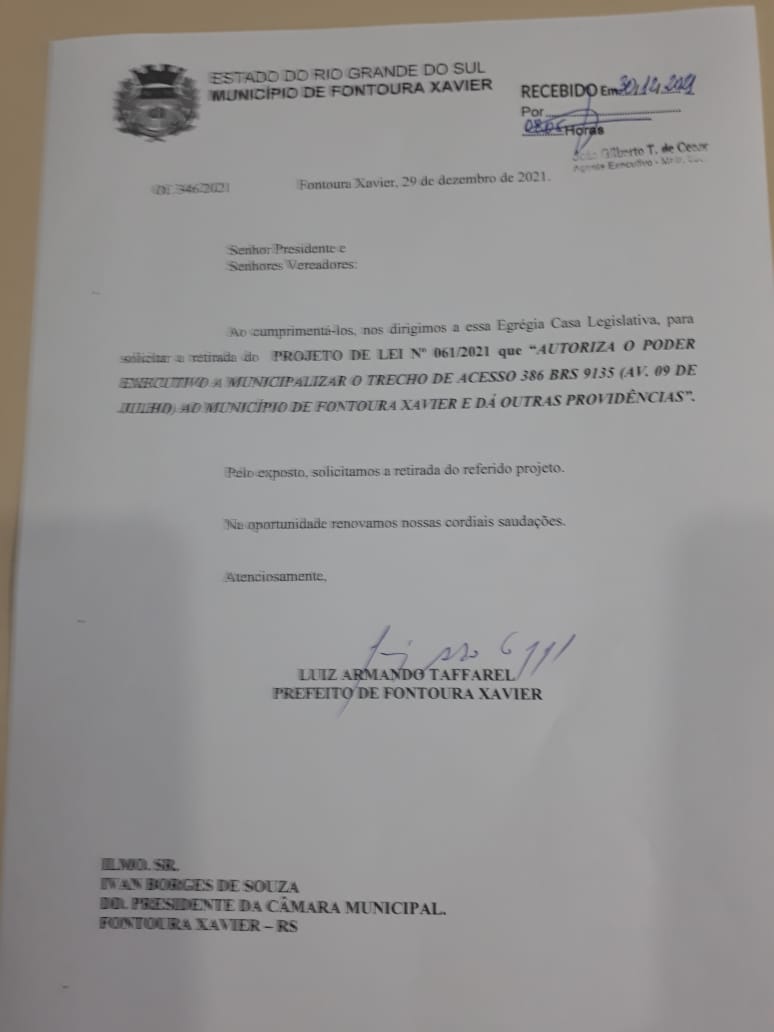 Situação: Em tramitação ( ) / Aprovado ( ) / Rejeitado ( ) / ( x ) Retirado – O PL 061/2021, foi retirado pelo Poder Executivo Municipal através do Ofício 346/2021, em 30/12/2021.